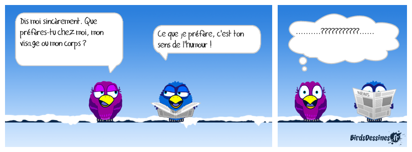 Case 1:Bird 1: Dis moi sincèrement. Que préfères-tu chez moi, mon visage ou mon corps ? | Case 2: Bird 1: Ce que je préfère, c'est ton sens de l'humour ! | Case 3: Bird 1: ..........???????????......