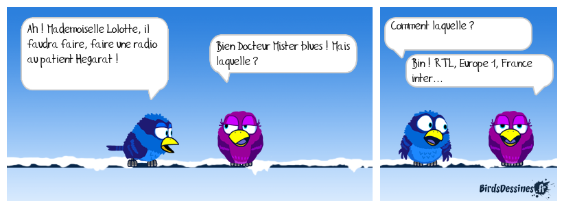 Case 1:Bird 1: Ah ! Mademoiselle Lolotte, il faudra faire, faire une radio au patient Hegarat ! | Case 2: Bird 1: Bien Docteur Mister blues ! Mais laquelle ? | Case 3: Bird 1: Comment laquelle ? Bird 2: Bin ! RTL, Europe 1, France inter...