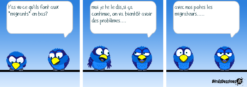 Case 1:Bird 1: t'as vu ce qu'ils font aux "migrants" en bas? Case 2:Bird 1: moi je te le dis,si ça continue, on va bientôt avoir des problèmes.... Case 3:Bird 1: avec nos potes les migrateurs.....