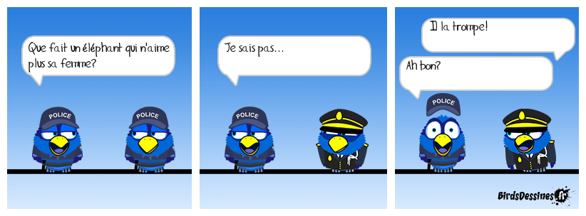 Case 1:Bird 1: Que fait un éléphant qui n'aime plus sa femme? | Case 2: Bird 1: Je sais pas... | Case 3: Bird 1: Il la trompe! Bird 2: Ah bon?