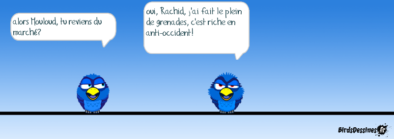 Case 1:Bird 1: alors Mouloud, tu reviens du marché? Case 2:Bird 1: oui, Rachid, j'ai fait le plein de grenades, c'est riche en anti-occident! Case 3:
