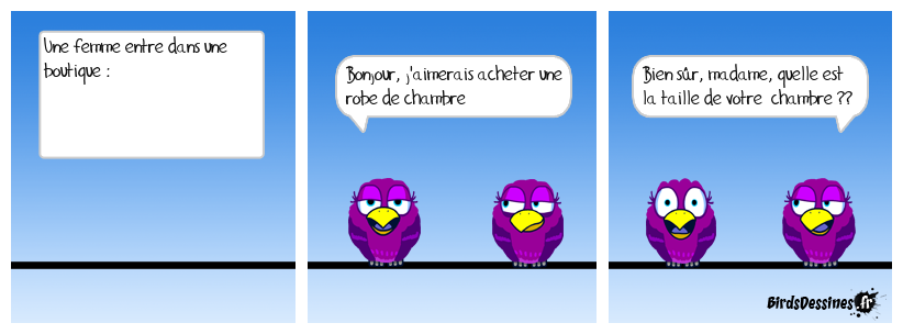 Case 1:Bird 1: Une femme entre dans une boutique : | Case 2: Bird 1: Bonjour, j'aimerais acheter une robe de chambre | Case 3: Bird 1: Bien sûr, madame, quelle est la taille de votre chambre ??