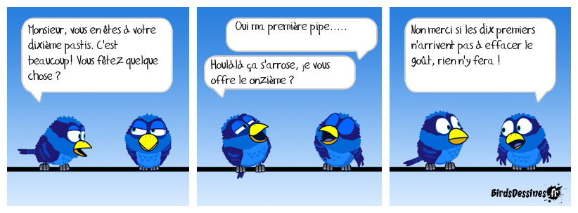Case 1:Bird 1: Monsieur, vous en êtes à votre dixième pastis. C'est beaucoup! Vous fêtez quelque chose ? | Case 2: Bird 1: Oui ma première pipe..... Bird 2: Houlàlà ça s'arrose, je vous offre le onzième ? | Case 3: Bird 1: Non merci si les dix premiers n'arrivent pas à effacer le goût, rien n'y fera !