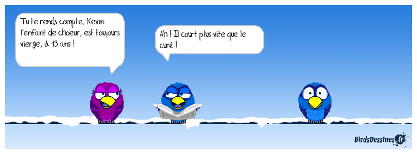 Case 1:Bird 1: Tu te rends compte, Kevin l'enfant de choeur, est toujours vierge, à 13 ans ! | Case 2: Bird 1: Ah ! Il court plus vite que le curé ! | Case 3: