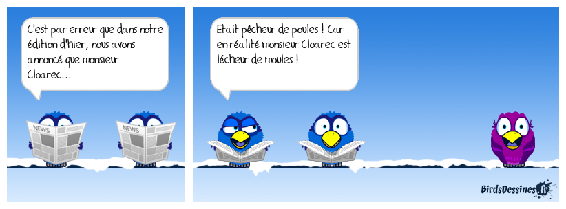 Case 1:Bird 1: C'est par erreur que dans notre édition d'hier, nous avons annoncé que monsieur Cloarec... | Case 2: Bird 1: Etait pêcheur de poules ! Car en réalité monsieur Cloarec est lécheur de moules ! | Case 3: