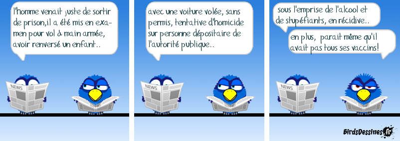 Case 1:Bird 1: l'homme venait juste de sortir de prison,il a été mis en exa-men pour vol à main armée, avoir renversé un enfant.. Case 2:Bird 1: avec une voiture volée, sans permis, tentative d'homicide sur personne dépositaire de l'autorité publique.. Case 3:Bird 1: sous l'emprise de l'alcool et de stupéfiants, en récidive.. Bird 2: en plus, parait même qu'il avait pas tous ses vaccins!