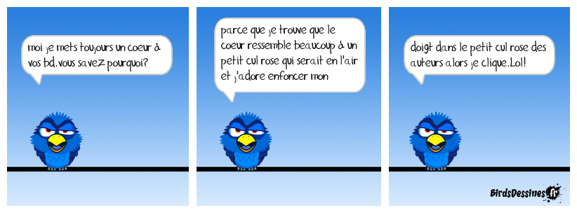Case 1:Bird 1: moi je mets toujours un coeur à vos bd.vous savez pourquoi? | Case 2: Bird 1: parce que je trouve que le coeur ressemble beaucoup à un petit cul rose qui serait en l'air et j'adore enfoncer mon | Case 3: Bird 1: doigt dans le petit cul rose des auteurs alors je clique.Lol!