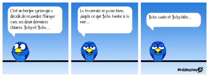 Case 1:Bird 1: C'est un berger syrien qui a décidé de rejoindre l'Europe avec ses deux dernières chèvres: Baby et Baba... | Case 2: Bird 1: La traversée se passe bien, jusqu'à ce que Baba tombe à la mer... | Case 3: Bird 1: Baba coule et Baby bêle...