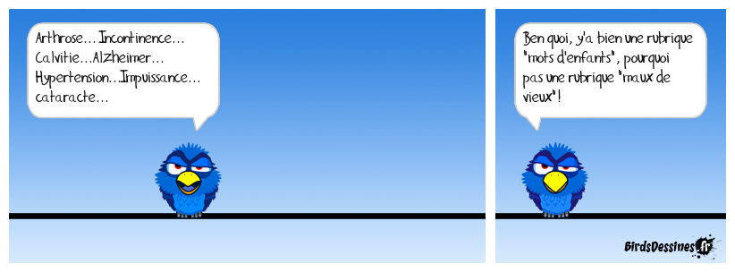 Case 1:Bird 1: Arthrose... Incontinence... Calvitie...Alzheimer... Hypertension...Impuissance... cataracte... | Case 2: | Case 3: Bird 1: Ben quoi, y'a bien une rubrique "mots d'enfants", pourquoi pas une rubrique "maux de vieux"!