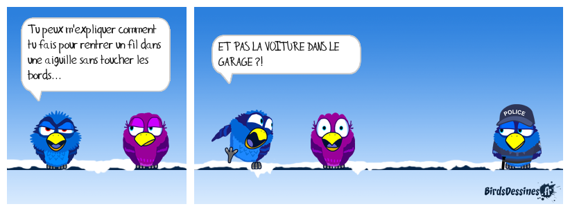 Case 1:Bird 1: Tu peux m'expliquer comment tu fais pour rentrer un fil dans une aiguille sans toucher les bords... | Case 2: Bird 1: ET PAS LA VOITURE DANS LE GARAGE ?! | Case 3: