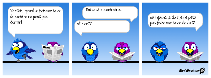 Case 1:Bird 1: Parfois, quand je bois une tasse de café je ne peux pas dormir!! | Case 2: Bird 1: Moi c'est le contraire... Bird 2: ah bon?? | Case 3: Bird 1: oui! quand je dors je ne peux pas boire une tasse de café