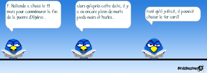 Case 1:Bird 1: F. Hollande a choisi le 19 mars pour commémorer la fin de la guerre d'Algérie.. Case 2:Bird 1: alors qu'après cette date, il y a eu encore plein de morts pieds-noirs et harkis.. Case 3:Bird 1: tant qu'il y était, il pouvait choisir le 1er avril!