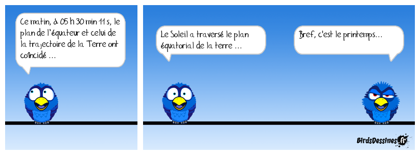Case 1:Bird 1: Ce matin, à 05 h 30 min 11 s, le plan de l’équateur et celui de la trajectoire de la Terre ont coïncidé ... | Case 2: Bird 1: Le Soleil a traversé le plan équatorial de la terre ... | Case 3: Bird 1: Bref, c'est le printemps...