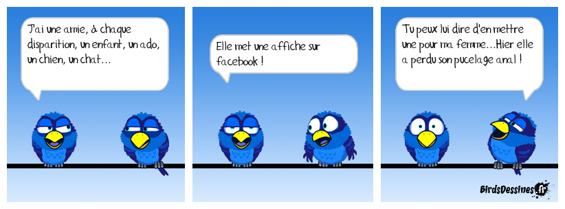Case 1:Bird 1: J'ai une amie, à chaque disparition, un enfant, un ado, un chien, un chat... | Case 2: Bird 1: Elle met une affiche sur facebook ! | Case 3: Bird 1: Tu peux lui dire d'en mettre une pour ma femme...Hier elle a perdu son pucelage anal !