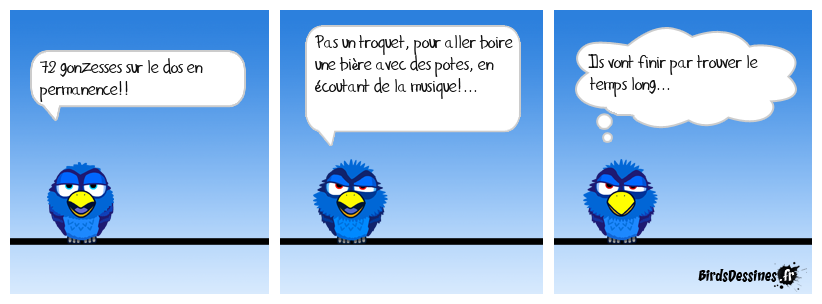 Case 1:Bird 1: 72 gonzesses sur le dos en permanence!! | Case 2: Bird 1: Pas un troquet, pour aller boire une bière avec des potes, en écoutant de la musique!... | Case 3: Bird 1: Ils vont finir par trouver le temps long...