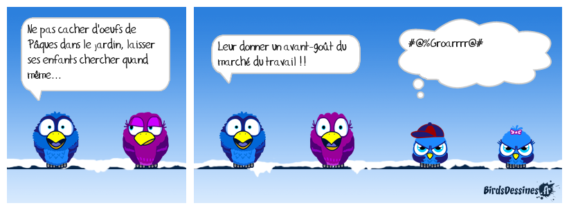 Case 1:Bird 1: Ne pas cacher d'oeufs de Pâques dans le jardin, laisser ses enfants chercher quand même... | Case 2: Bird 1: Leur donner un avant-goût du marché du travail !! | Case 3: Bird 1: #@%Groarrrr@#