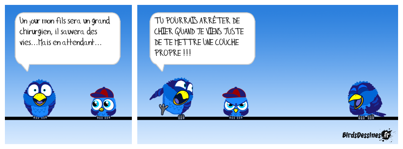 Case 1:Bird 1: Un jour mon fils sera un grand chirurgien, il sauvera des vies...Mais en attendant... | Case 2: Bird 1: TU POURRAIS ARRÊTER DE CHIER QUAND JE VIENS JUSTE DE TE METTRE UNE COUCHE PROPRE !!! | Case 3: