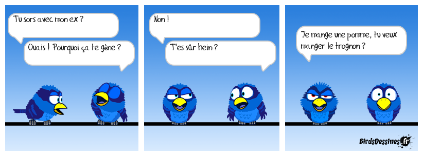 Case 1:Bird 1: Tu sors avec mon ex ?Bird 2: Ouais ! Pourquoi ça te gène ? | Case 2: Bird 1: Non ! Bird 2: T'es sûr hein ? | Case 3: Bird 1: Je mange une pomme, tu veux manger le trognon ?
