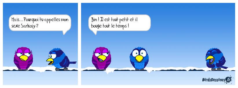 Case 1:Bird 1: Mais...Pourquoi tu appelles mon sexe Sarkosy ? | Case 2: Bird 1: Bin ! Il est tout petit et il bouge tout le temps ! | Case 3: