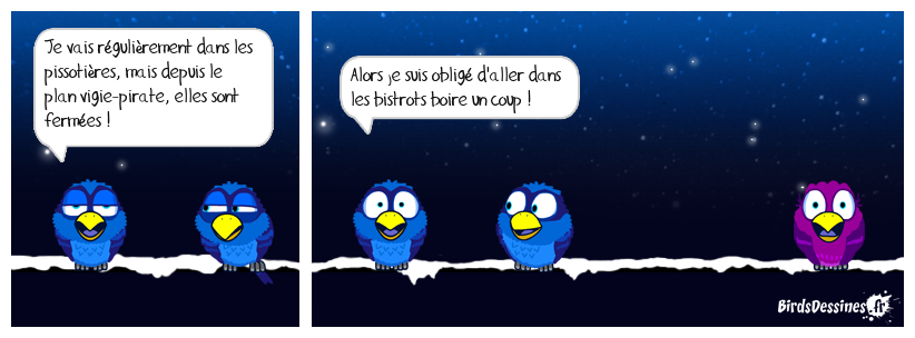 Case 1:Bird 1: Je vais régulièrement dans les pissotières, mais depuis le plan vigie-pirate, elles sont fermées ! | Case 2: Bird 1: Alors je suis obligé d'aller dans les bistrots boire un coup ! | Case 3: