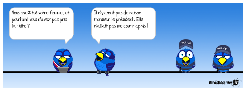 Case 1:Bird 1: Vous avez tué votre femme, et pourtant vous n'avez pas pris la fuite ? | Case 2: Bird 1: Il n'y avait pas de raison monsieur le président. Elle n'allait pas me courir après ! | Case 3: