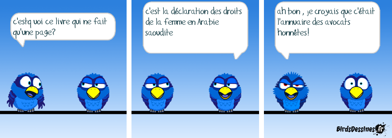 Case 1:Bird 1: c'estq uoi ce livre qui ne fait qu'une page? Case 2:Bird 1: c'est la déclaration des droits de la femme en Arabie saoudite Case 3:Bird 1: ah bon , je croyais que c'était l'annuaire des avocats honnêtes!
