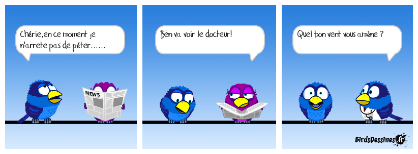 Case 1:Bird 1: Chérie,en ce moment je n'arrete pas de péter...... | Case 2: Bird 1: Ben va voir le docteur! | Case 3: Bird 1: Quel bon vent vous amène ?