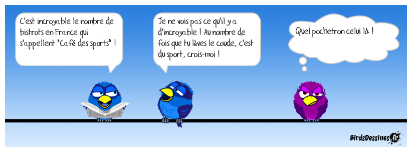 Case 1:Bird 1: C'est incroyable le nombre de bistrots en France qui s'appellent "Café des sports" ! | Case 2: Bird 1: Je ne vois pas ce qu'il y a d'incroyable ! Au nombre de fois que tu lèves le coude, c'est du sport, crois-moi ! | Case 3: Bird 1: Quel pochetron celui là !