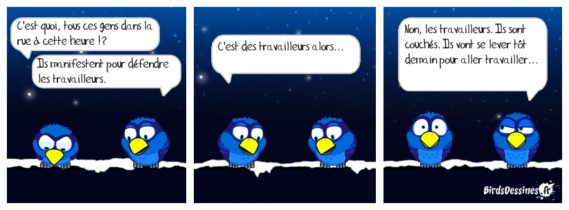 Case 1:Bird 1: C'est quoi, tous ces gens dans la rue à cette heure !?Bird 2: Ils manifestent pour défendre les travailleurs. | Case 2: Bird 1: C'est des travailleurs alors... | Case 3: Bird 1: Non, les travailleurs. Ils sont couchés. Ils vont se lever tôt demain pour aller travailler...