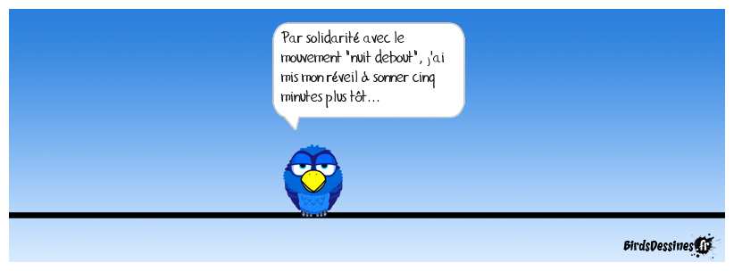 Case 1: | Case 2: Bird 1: Par solidarité avec le mouvement "nuit debout", j'ai mis mon réveil à sonner cinq minutes plus tôt... | Case 3: