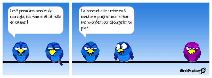Case 1:Bird 1: Les 5 premières années de mariage, ma femme était nulle en cuisine ! | Case 2: Bird 1: Maintenant elle arrive en 3 minutes à programmer le four micro-ondes pour décongeler un plat ! | Case 3: