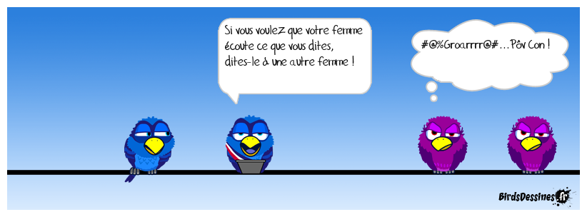 Case 1: | Case 2: Bird 1: Si vous voulez que votre femme écoute ce que vous dites, dites-le à une autre femme ! | Case 3: Bird 1: #@%Groarrrr@#...Pôv Con !