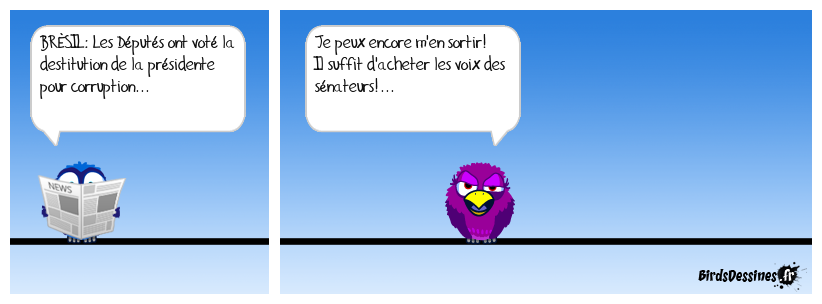 Case 1:Bird 1: BRÉSIL: Les Députés ont voté la destitution de la présidente pour corruption... | Case 2: Bird 1: Je peux encore m'en sortir! Il suffit d'acheter les voix des sénateurs!... | Case 3: