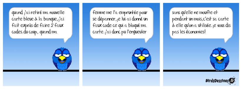 Case 1:Bird 1: quand j'ai retiré ma nouvelle carte bleue à la banque,j'ai fait exprès de faire 2 faux codes.du coup, quand ma | Case 2: Bird 1: femme me l'a empruntée pour se dépanner,je lui ai donné un faux code ce qui a bloqué ma carte.j'ai donc pu l'engueuler | Case 3: Bird 1: sans qu'elle ne moufte et pendant un mois,c'est sa carte à elle qu'on a utilisée.je vous dis pas les économies!