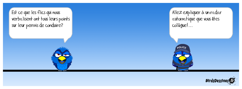 Case 1:Bird 1: Est ce que les flics qui nous verbalisent ont tous leurs points sur leur permis de conduire? | Case 2: | Case 3: Bird 1: Allez expliquer à un radar automatique que vous êtes collègue!...