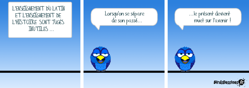 Case 1:Bird 1: L'ENSEIGNEMENT DU LATIN ET L'ENSEIGNEMENT DE L'HISTOIRE SONT JUGÉS INUTILES ... Case 2:Bird 1: Lorsqu'on se sépare de son passé... Case 3:Bird 1: ...le présent devient muet sur l'avenir !