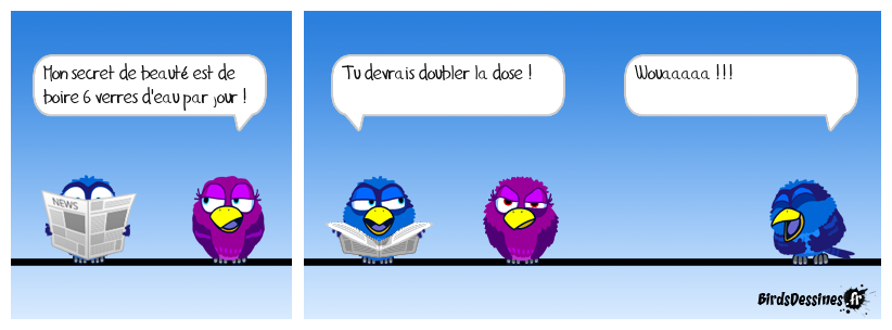 Case 1:Bird 1: Mon secret de beauté est de boire 6 verres d'eau par jour ! | Case 2: Bird 1: Tu devrais doubler la dose ! | Case 3: Bird 1: Wouaaaaa !!!