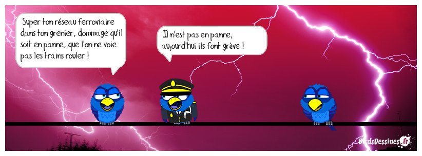 Case 1:Bird 1: Super ton réseau ferroviaire dans ton grenier, dommage qu'il soit en panne, que l'on ne voie pas les trains rouler ! | Case 2: Bird 1: Il n'est pas en panne, aujourd'hui ils font grève ! | Case 3:
