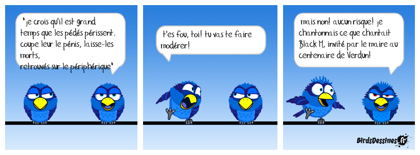 Case 1:Bird 1: "je crois qu'il est grand temps que les pédés périssent. coupe leur le pénis, laisse-les morts, retrouvés sur le périphérique" | Case 2: Bird 1: t'es fou, toi! tu vas te faire modérer! | Case 3: Bird 1: mais non! aucun risque! je chantonnais ce que chantait Black M, invité par le maire au centenaire de Verdun!