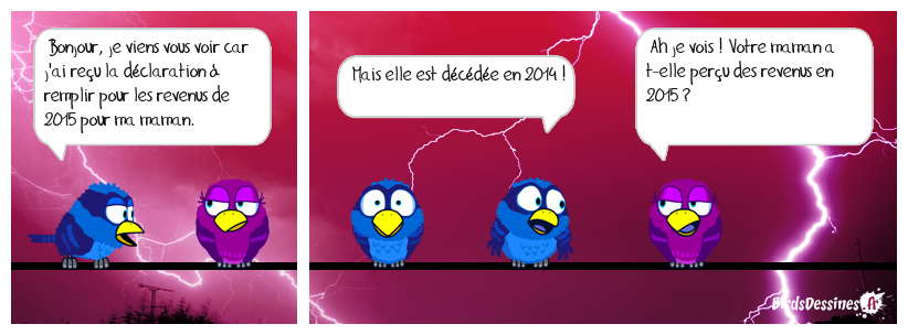 Case 1:Bird 1: Bonjour, je viens vous voir car j'ai reçu la déclaration à remplir pour les revenus de 2015 pour ma maman. | Case 2: Bird 1: Mais elle est décédée en 2014 ! | Case 3: Bird 1: Ah je vois ! Votre maman a t-elle perçu des revenus en 2015 ?