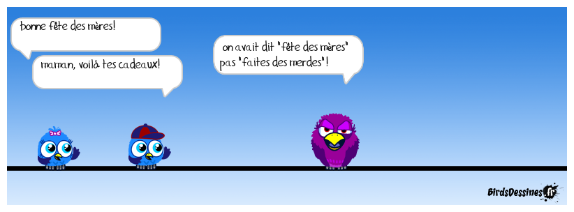 Case 1:Bird 1: bonne fête des mères!Bird 2: maman, voilà tes cadeaux! | Case 2: Bird 1: on avait dit "fête des mères" pas "faites des merdes"! | Case 3: