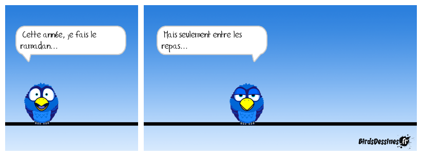 Case 1:Bird 1: Cette année, je fais le ramadan... | Case 2: Bird 1: Mais seulement entre les repas... | Case 3: