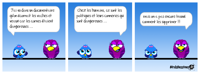 Case 1:Bird 1: J'ai vu dans un documentaire qu'on écornait les vaches et veaux car les cornes étaient dangereuses ... | Case 2: Bird 1: Chez les humains, ce sont les politiques et leurs conneries qui sont dangereuses ... | Case 3: Bird 1: mais on a pas encore trouvé comment les supprimer !!