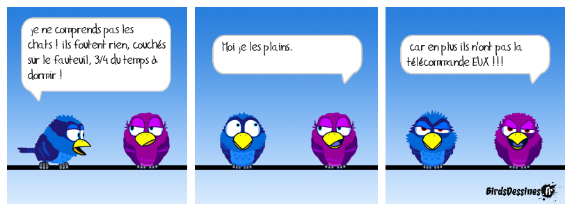 Case 1:Bird 1: je ne comprends pas les chats ! ils foutent rien, couchés sur le fauteuil, 3/4 du temps à dormir ! | Case 2: Bird 1: Moi je les plains. | Case 3: Bird 1: car en plus ils n'ont pas la télécommande EUX !!!