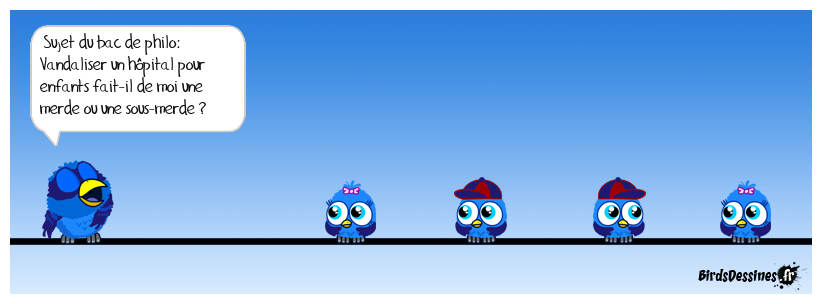 Case 1:Bird 1: Sujet du bac de philo: Vandaliser un hôpital pour enfants fait-il de moi une merde ou une sous-merde ? | Case 2: | Case 3: