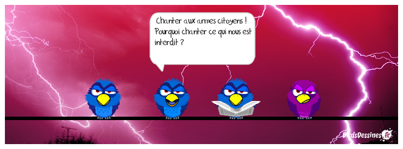Case 1: | Case 2: Bird 1: Chanter aux armes citoyens ! Pourquoi chanter ce qui nous est interdit ? | Case 3: