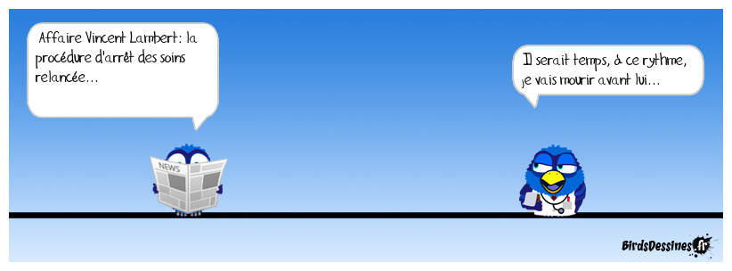Case 1:Bird 1: Affaire Vincent Lambert: la procédure d'arrêt des soins relancée... | Case 2: | Case 3: Bird 1: Il serait temps, à ce rythme, je vais mourir avant lui...