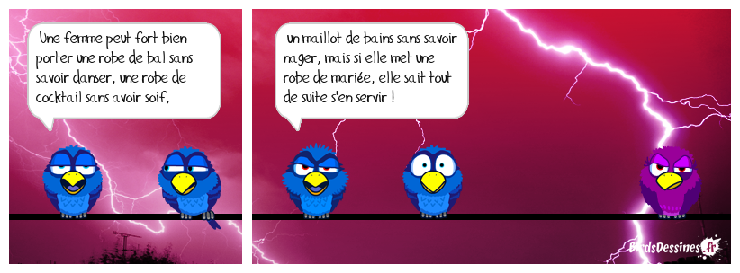 Case 1:Bird 1: Une femme peut fort bien porter une robe de bal sans savoir danser, une robe de cocktail sans avoir soif, | Case 2: Bird 1: un maillot de bains sans savoir nager, mais si elle met une robe de mariée, elle sait tout de suite s'en servir ! | Case 3: