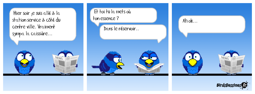 Case 1:Bird 1: Hier soir je suis allé à la station service à côté du centre ville. Vraiment sympa la caissière... | Case 2: Bird 1: Et toi tu la mets où ton essence ? Bird 2: Dans le réservoir.. | Case 3: Bird 1: Ah ok...