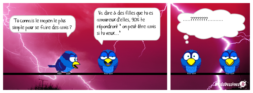 Case 1:Bird 1: Tu connais le moyen le plus simple pour se faire des amis ? | Case 2: Bird 1: Va dire à des filles que tu es amoureux d'elles, 90% te répondront " on peut être amis si tu veux..." | Case 3: Bird 1: .....????????..........